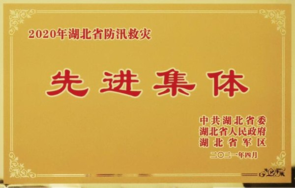 • 证书名称:2020年湖北省防汛救灾先进集体 获得时间:2021年4月