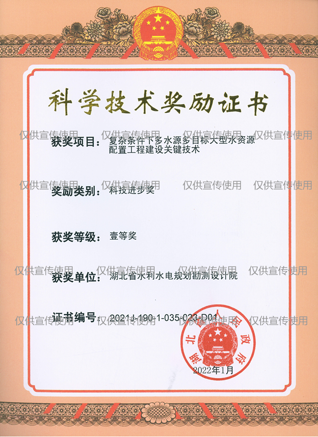 • 证书名称:复杂条件下多水源多目标大型水资源配置工程建设关键技术 获得时间:2022年1月