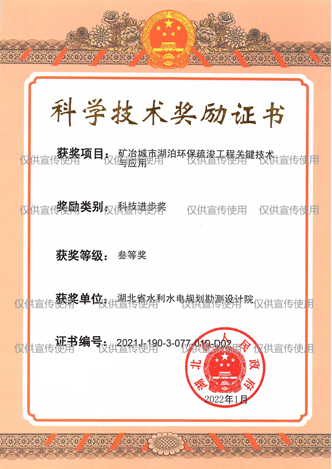 • 证书名称:矿冶城市湖泊环保疏浚工程关键技术与应用 获得时间:2022年1月